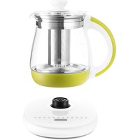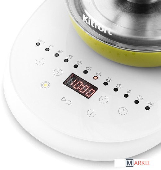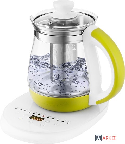 Электрический чайник с сенсорным управлением КТ-6130 является универсальным прибором для приготовления не только напитков, но и пищи. Помимо кипячения, прибор греет воду до заданной t, а также имеет специальные программы для приготовления различных блюд.Чайник греет воду от 40 до 100 °С с шагом 5 °С, что очень удобно при заваривании разных сортов чая или приготовления детского питания. Вы можете настроить необходимую t сами либо выбрать для этого режим (травяной, ароматизированный или черный чай).В комплекте идёт чаезаварочный фильтр для заваривания чая прямо в чайнике. Вам нужно только засыпать листья в фильтр, залить воду и выбрать t или режим. Фильтр легко снимается, моется и устанавливается обратно.У КТ-6130 имеется 11 предустановленных программ приготовления различных блюд и напитков: варка супа, каши, спагетти, круп, подогрев молока и тд. Также есть функция поддержания t и автозапуска, которые можно использовать одновременно.В комплекте идёт подставка для 6 яиц, а у чайника есть специальный режим для их варки. Программа доводит воду до кипения, а затем поддерживает кипение, нагревая воду на мощности 500 Вт в течение 8 минут.На подставке расположена панель управления, кнопки вкл/выкл, кнопки выбора программ, кнопки включения и поддержания t и автозапуска, а также LED-дисплей. На ярком дисплее отображается t воды и время.Чайник КТ-6130 отлично подойдёт для тёплых встреч с семьёй и друзьями. За один раз в чайнике можно вскипятить до 1,8 л воды. Этого хватит, чтобы приготовить горячие напитки на большую семью. Ручка чайника пластиковая, не нагревается и удобно лежит в руке.Корпус и крышка чайника выполнены из стекла, а подставка – из сочетания стекла и пластмассы. Мерная шкала нанесена на прозрачную часть корпуса. Съемная крышка и широкое горлышко облегчает доступ внутрь при мойке и во время удаления накипи.Подставка с центральным контакт даёт возможность располагать на ней чайник в любом положении, обеспечивая вращение на 360°. Имеется защита при закипании, при включения чайника без воды.