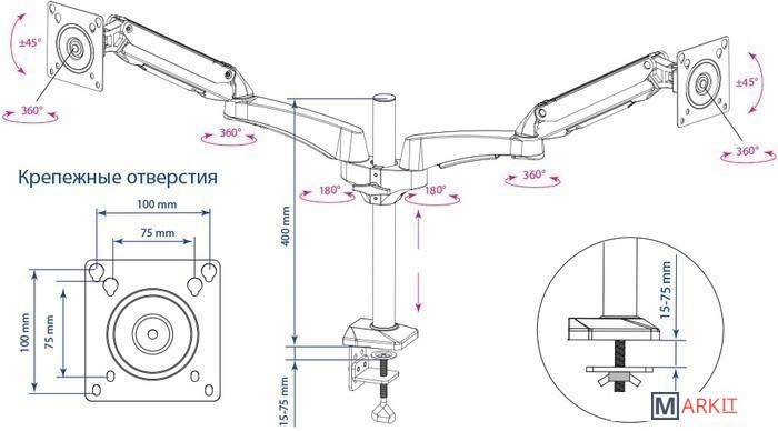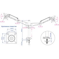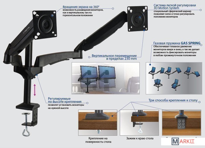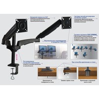 | Функциональные особенности | поворотный, с регулировкой высоты, кабель-канал, струбцинное крепление / поворотный, с регулировкой высоты, кабель-канал, струбцинное крепление, для 2 мониторов |