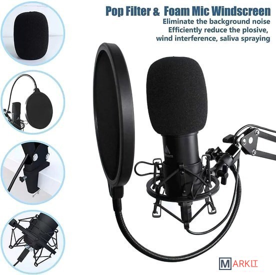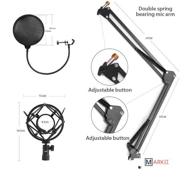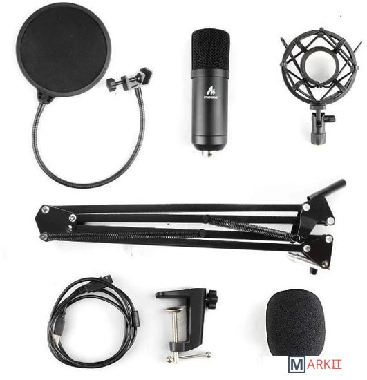 - съемная ветрозащита- поп-фильтр- кабель питания (USB Type-B - USB Type-A)- стойка с настольным зажимом- антивибрационный держатель- документация |