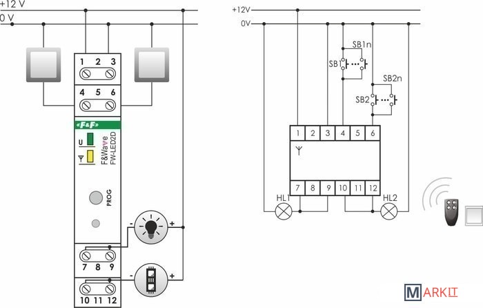 Двухканальный диммер-реле, для LED ламп и LED лент, soft start, локальное и удаленное управление, до 8 радио передатчиков, монтаж на DIN-рейкуМодуль FW-LED2D предназначен для дистанционного управления по радиоканалу (включить/выключить, диммировать) светодиодными лампами и лентами LED с питанием 12 В.- двухканальный модуль;- возможность управления модулем с 8-ми пультов;- местное управление – возможно управлять модулем непосредственно подключенными к его входам моностабильными выключателями (без фиксации);- «Soft start» – плавное изменение яркости при включении и выключении;- ретрансляция сигналов управления – позволяет увеличить дальность радиосвязи;- встроенная электронная тепловая защита – предохраняет устройство от повреждения в случае перегрузки.Дистанционное управление модулем FW-LED2D осуществляется при помощи следующих передатчиков и пультов F&Wave:- FW-RC10 и FW-RC4 – 10 и 4-канальные пульты дистанционного управления;- FW-WSO2 – 2-клавишные выключатели для дистанционного управления (напряжение питания от аккумулятора 3В DC, монтаж на плоскость);- FW-RC5 – 5-канальный передатчик по радиоканалу (напряжение питания от аккумулятора 3В DC, с входами местного управления и отдельными входами ON (сценарий «Вкл. ВСЕ») и OFF (сценарий «Выкл. ВСЕ»);- FW-RC4AC – 4-канальный передатчик по радиоканалу (напряжение питания 230 В АС, с входами местного управления и возможность изменения конфигурации входов S1 и S2 на функцию ON (сценарий «Вкл. ВСЕ») и (или) OFF (сценарий «Выкл. ВСЕ»);- FW-GS-W/B - 4 канальный передатчик по радиоканалу, сенсорный, материал - стекло, исполнение черное и белое.ВНИМАНИЕ!Управляющий вход не работает с выключателями с подсветкой! Передатчики и пульты F&Wave работают c модулем по принципу бистабильного реле: одно кратковременное нажатие кнопки пульта или передатчика включает нагрузку, второе нажатие выключает нагрузку, длительное нажатие (более 1 секунды) увеличивает или уменьшает уровень яркости с шагом 10%.Передатчики FW-RC5 и FW-RC4AC имеют дополнительные входы ON (Сценарий «Вкл. ВСЕ») и OFF (Сценарий «Выкл. ВСЕ»).Учитывая характер передачи и ретрансляции сигнала, не следует использовать одни и те же кнопки на передатчике чаще чем через 2 секунды. Переключение модуля может происходить с небольшим опозданием.Не рекомендуется применение передатчиков FW-RC4 и FW-RC10 для управления группой приемников, т.к. необходимо учитывать возможность нарушения синхронизации включения (особенно при работе на больших расстояниях) или их одновременное использование с местными выключателями.